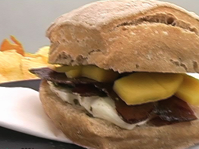 Сложносочиненный сендвич с манго и ветчиной.Состав:чиабатта — 4 штуки;манго — 1 штука;сыр — 150 гр;утиная ветчина — 9 кусочков;орегано, оливковое масло, соль — по вкусу.